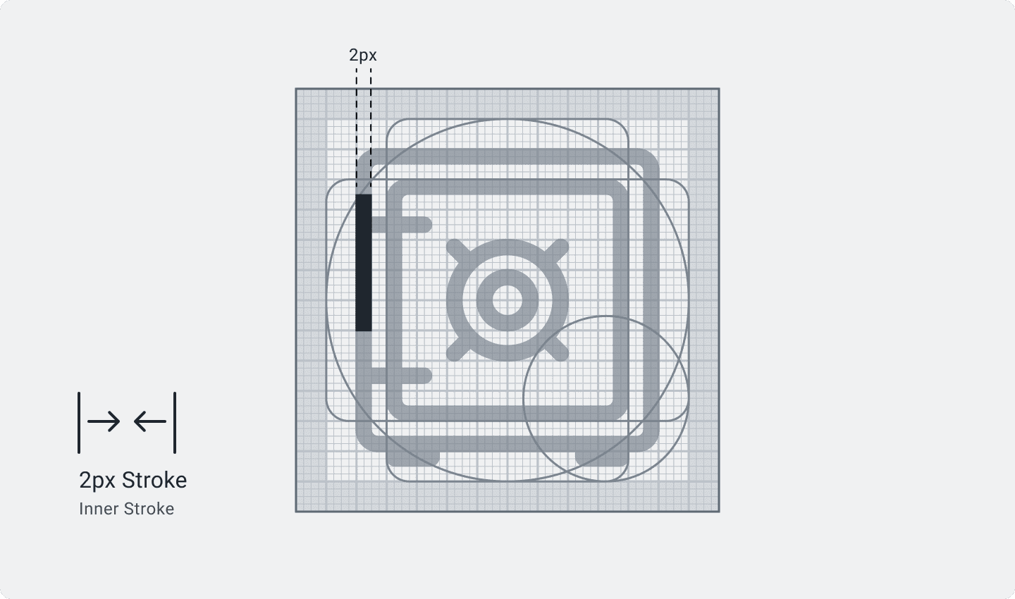 Maintain a 2px inner stroke on all shapes used to build an icon, this includes the use of circles. An inner stroke allows the icon to remain consistent when a corner radius is applied later on.
