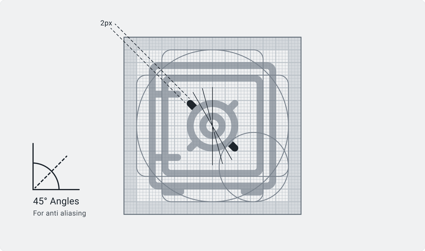 Use 45° angles for even anti-aliasing on icons, maintain 15° steps when more extreme angles are required.