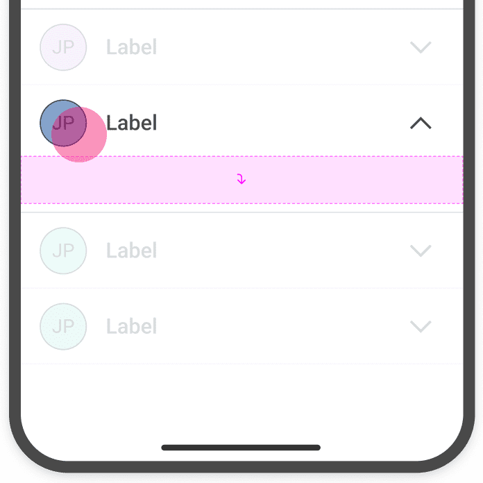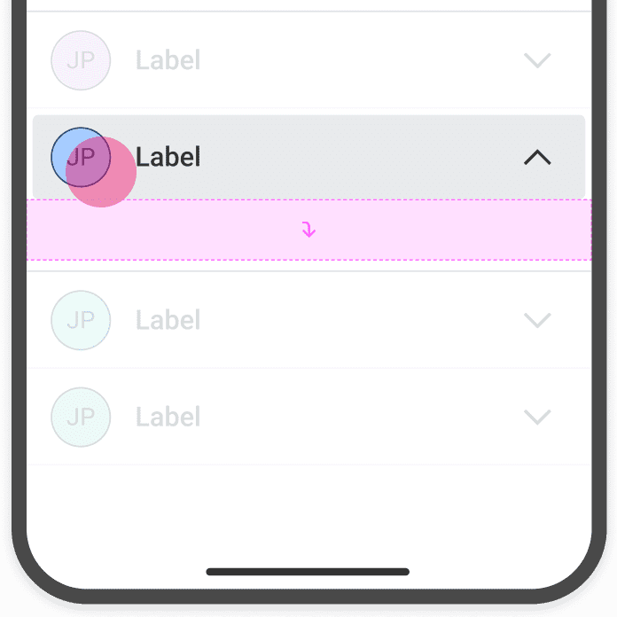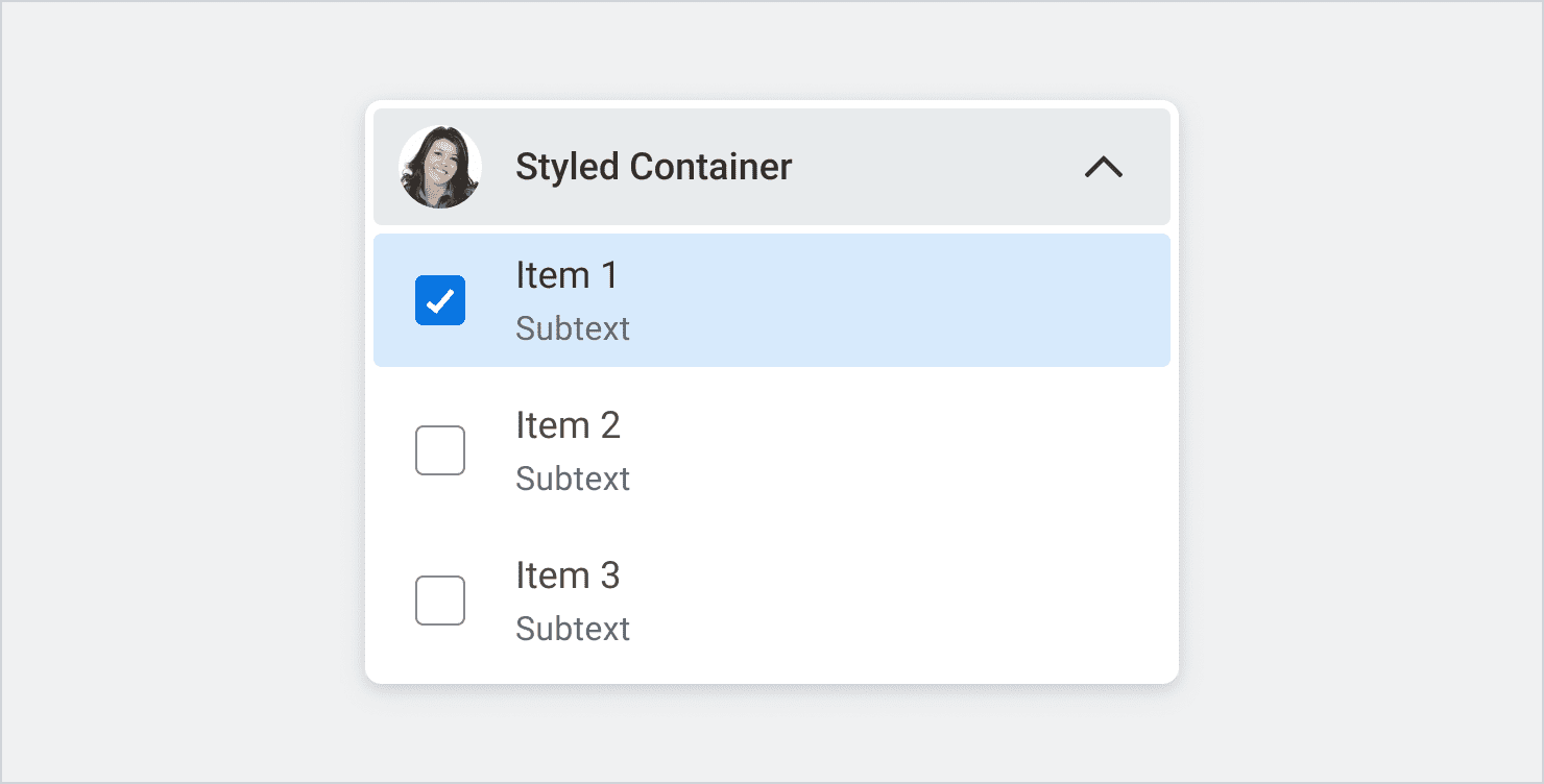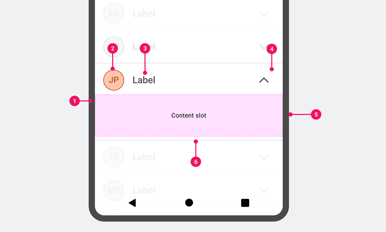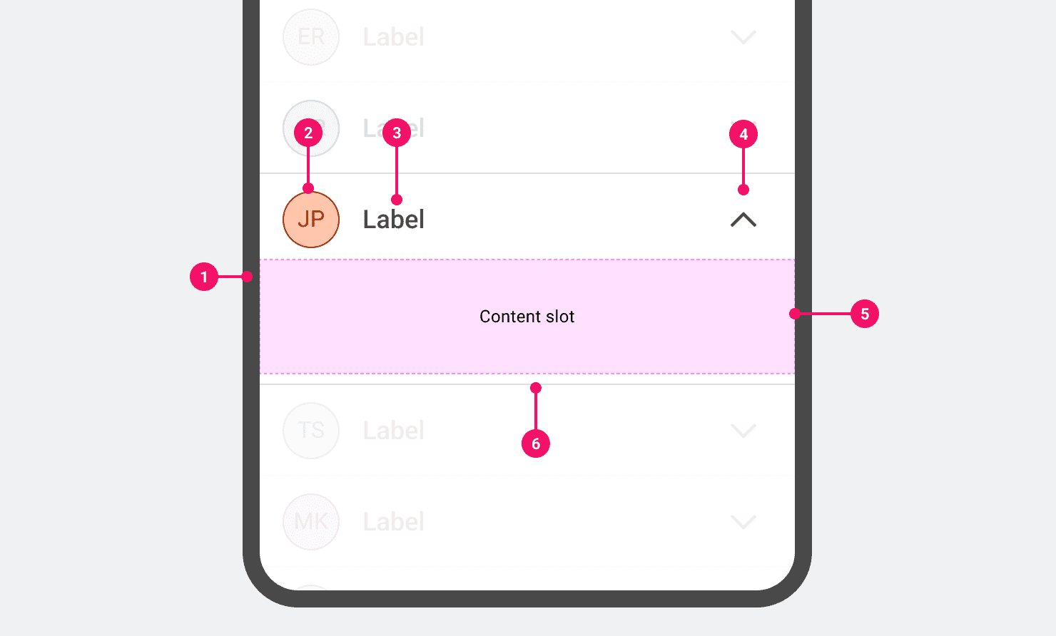 - Expandable Header: Contains a label, chevron, and optional leading element.