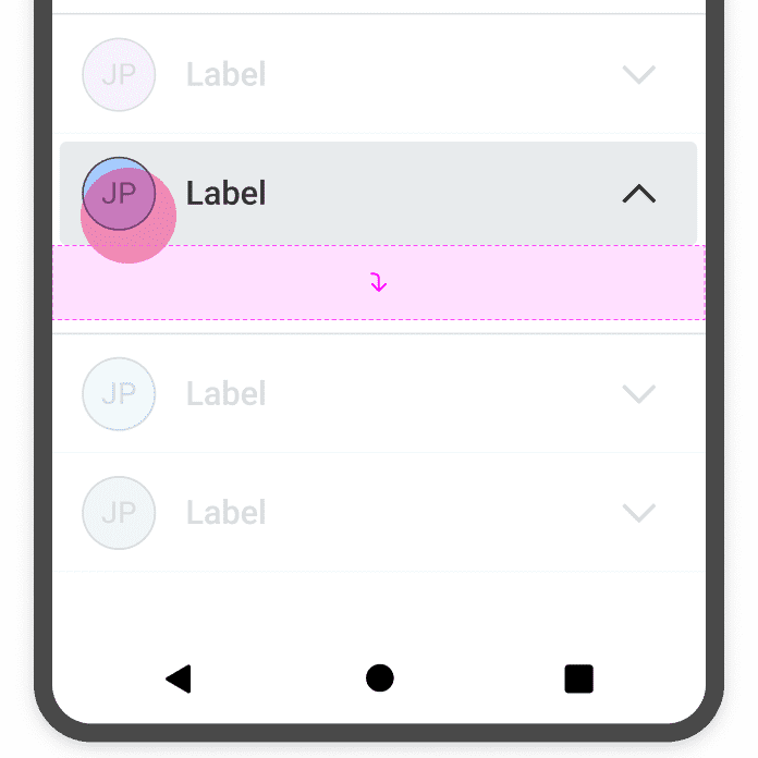 On larger screens like tablets, the icon is placed at start of the container before any visuals or the label. During expansion, the chevron rotates clockwise 90 degrees until the content is fully expanded