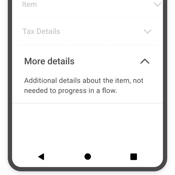 - This component highlights the most important details of a section and reveals more when a user taps or clicks on the header part of the container.