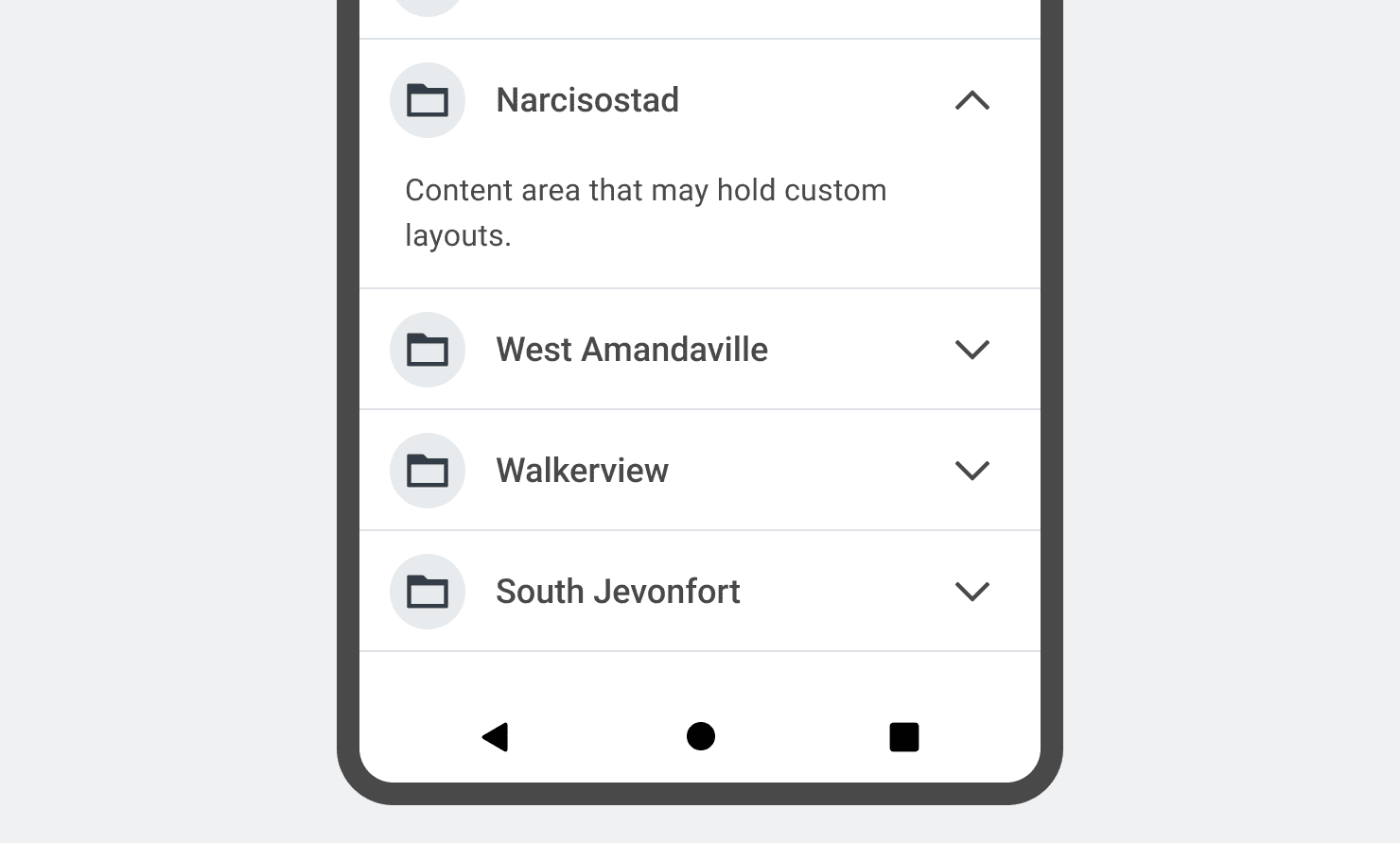 - For folder or tree navigation, use a List with a trailing rightward chevron to redirect elsewhere. Expandable Containers are used to show and hide content on the same screen — not for navigation.