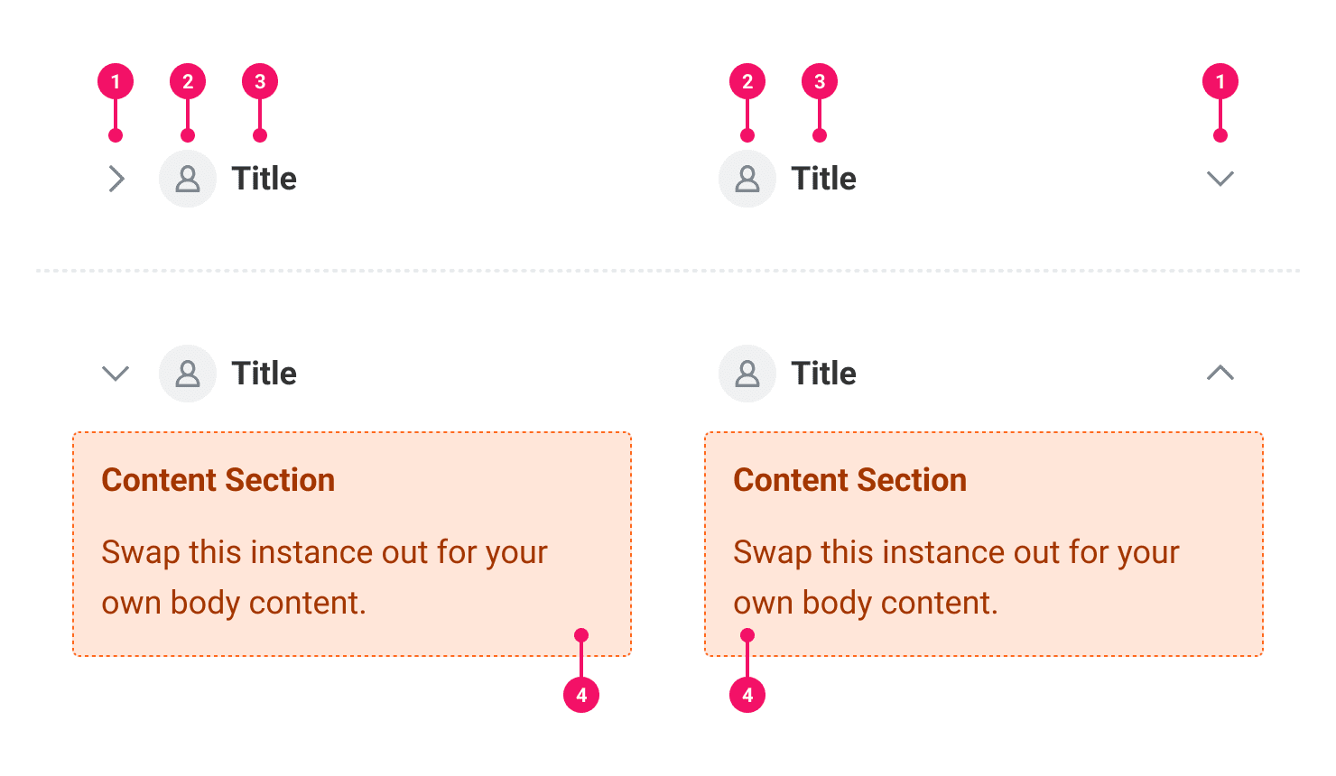 - Chevron Icon: This is part of the header to indicate the opened or closed state of the container. This icon could be placed on the left or right side of the header. When the chevron is on the left of the Title, it shows Chevron Right for 'collapsed' and Chevron Down for 'expanded.' When the chevron is on the right of the Title, it shows Chevron Down for 'collapsed' and Chevron Up for 'expanded.'