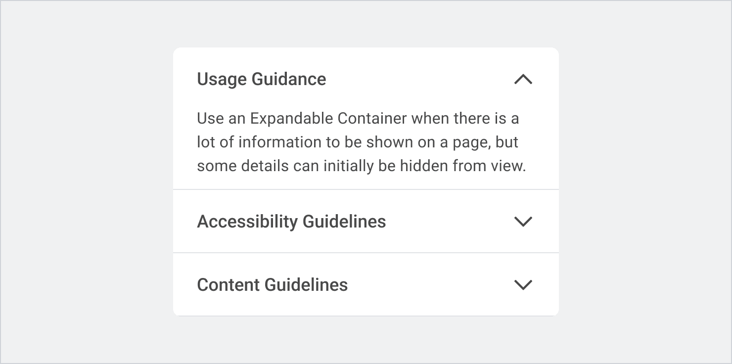 Expandable Containers are helpful to declutter a UI and focus user attention on more important details. Use an Expandable Container to: