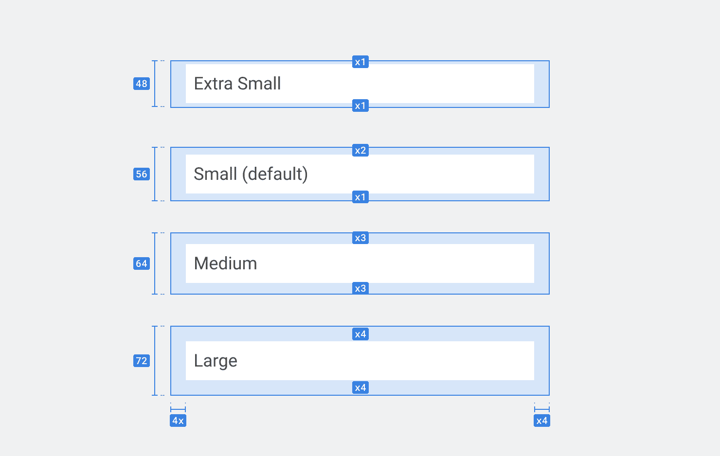 Use 'x-small' for denser action lists. The 'small' size is the default, and is suitable for most lists. If more space is required for actions like local navigation, 'medium' and 'large' sizes should be used. Increases in size only increase the height of '''ListItem''' - width is not impacted.