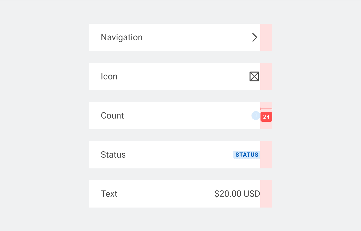 Used to display secondary information that reinforces the interaction to follow, or provide more details into the entry. They're placed at the end of the item, and can denote status, a count, or to hint at the interaction to follow.