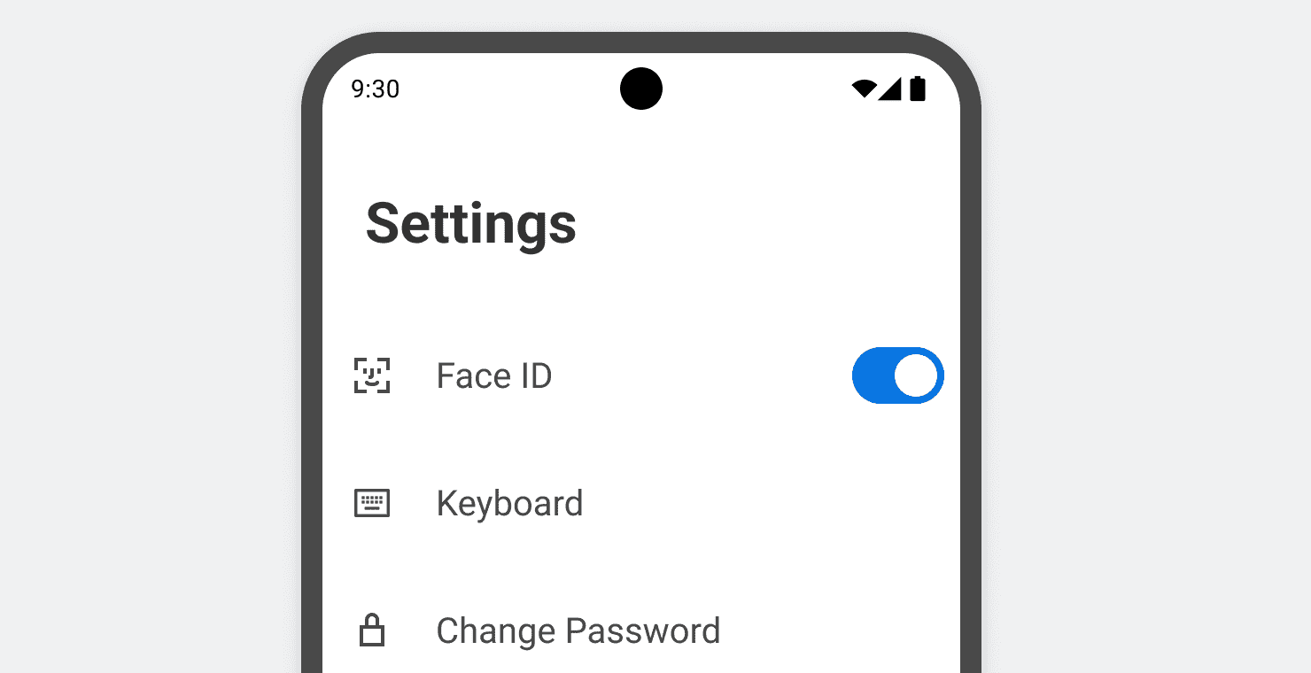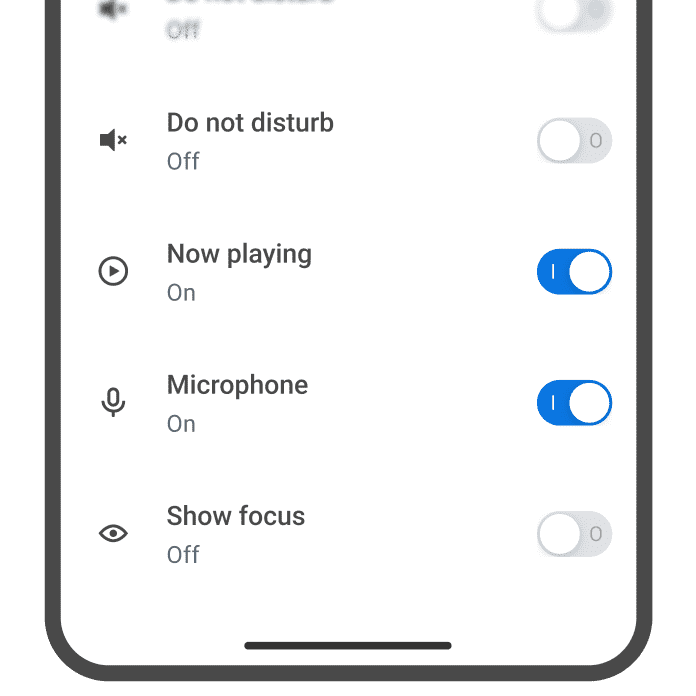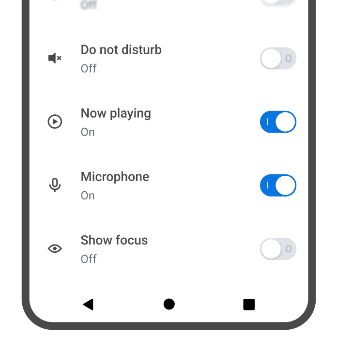 Large single line list items with a leading system icon, Body Large text, and Switches to toggle settings on/off.