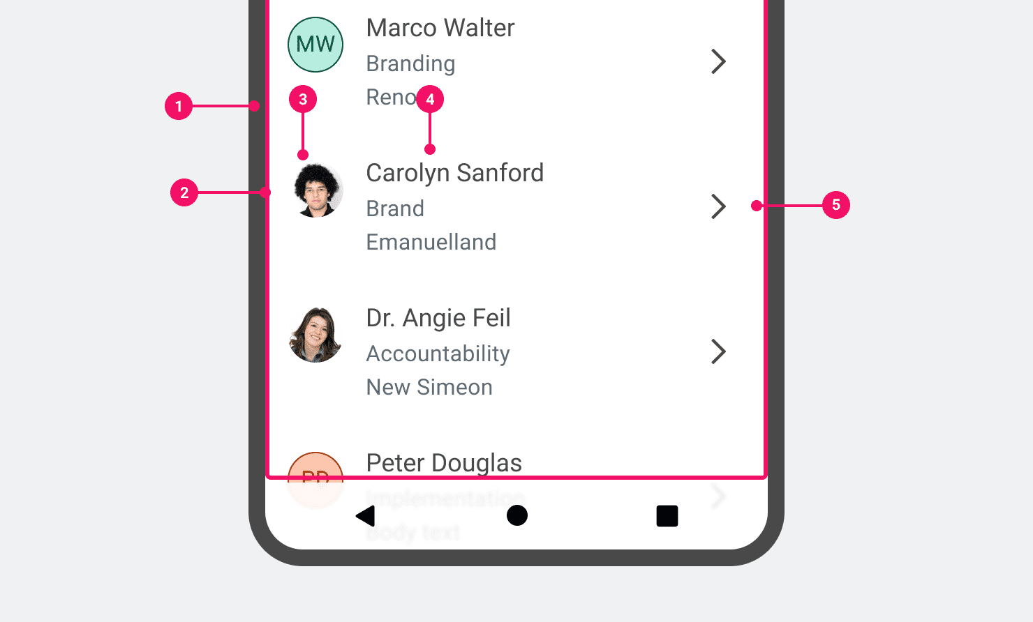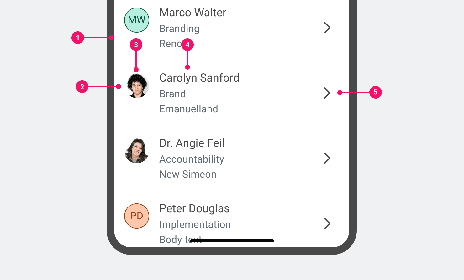 ListItems are related to each other by a larger group, the List. Items in the same list should have the same content structure, sharing anatomy, size and styling. Having this repeatable structure makes Lists easier to scan.