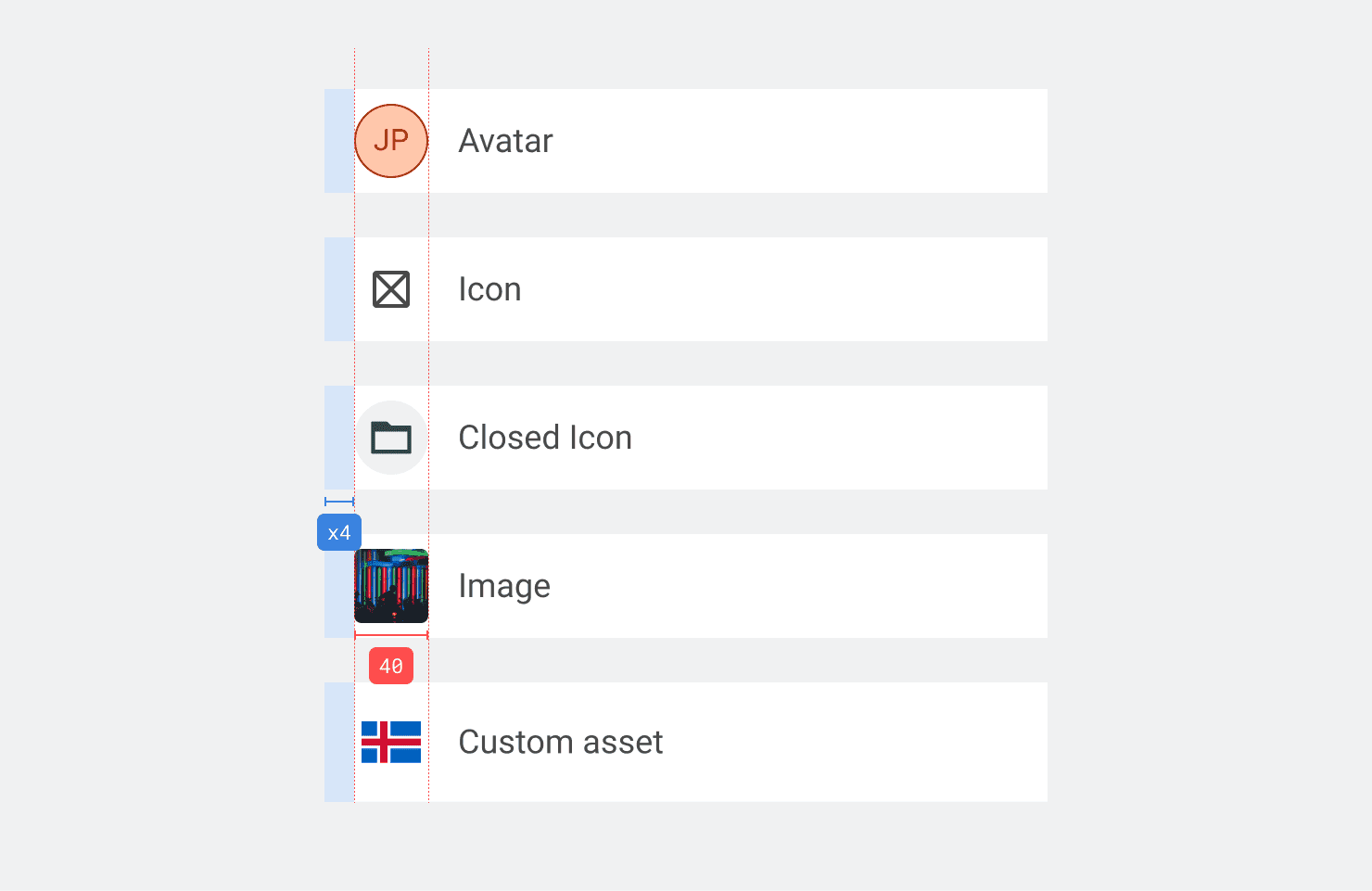 - Lead Content (Optional): Visual elements such Avatars or Icons placed at the start of the row