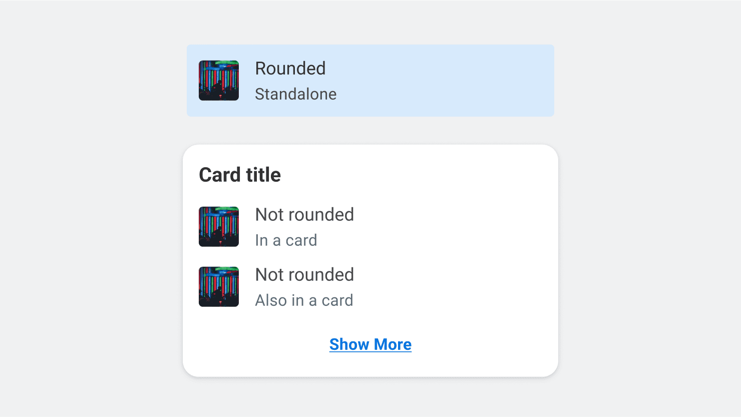 '''ListItem''' is 'Rounded' by default — they use a mobile friendly inset styling that is visible when pressed or selected. This inset styling may be disabled if used as a standalone element, such as within a Card.