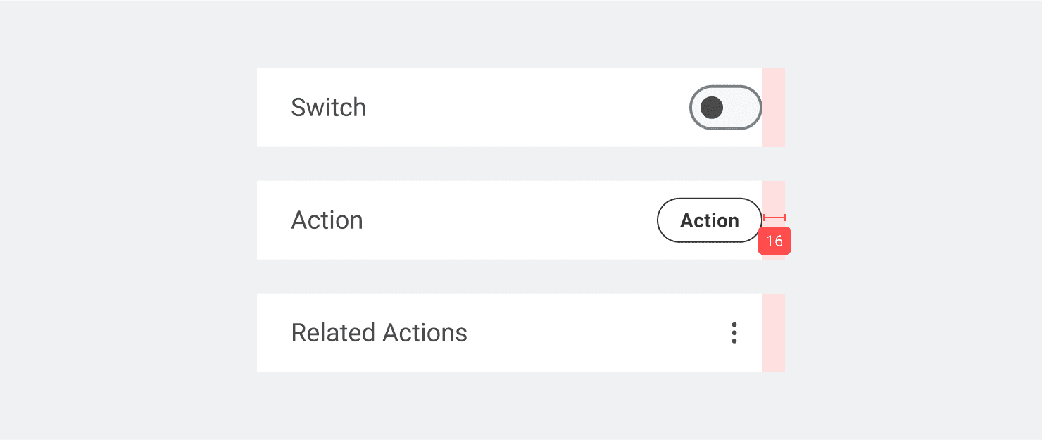 - Secondary actions are placed at the end of the row and have their own touch target.