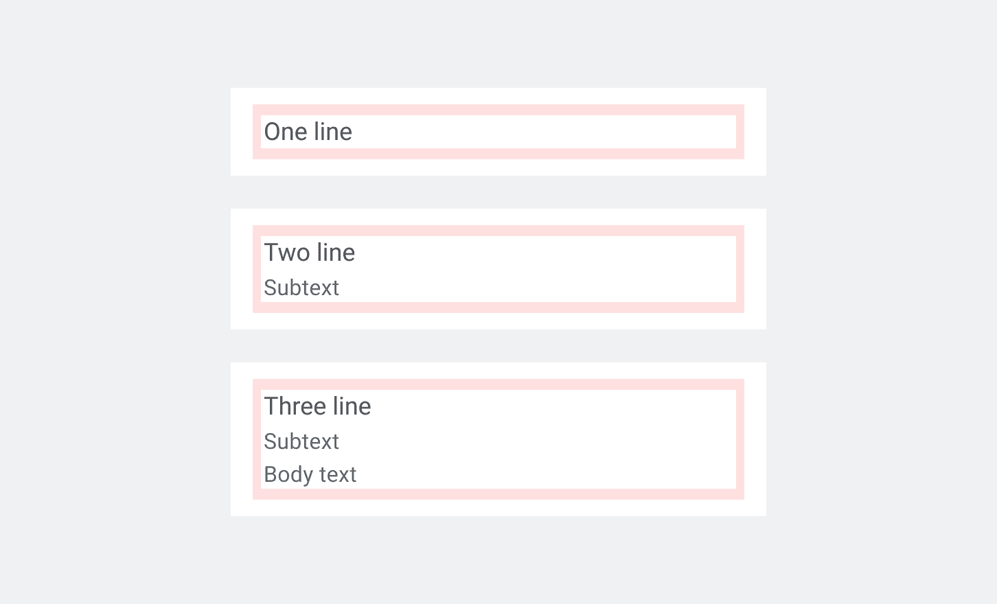 'ListItem' can have 1, 2, or 3 lines of text. Lines represent a new row within the body of the List Item. The first line serves as the identifying label and is the only mandatory element of the List Item. The 2nd and 3rd line can be used for attributes and body text.