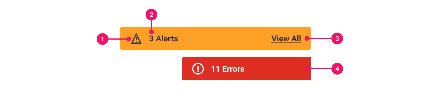 - Action Text (Conditional): Link text that indicates the Banner is actionable. Activating the link opens a list of all errors and alerts on a page. Action text is only available in the full Banner variant and has a default value of View All.