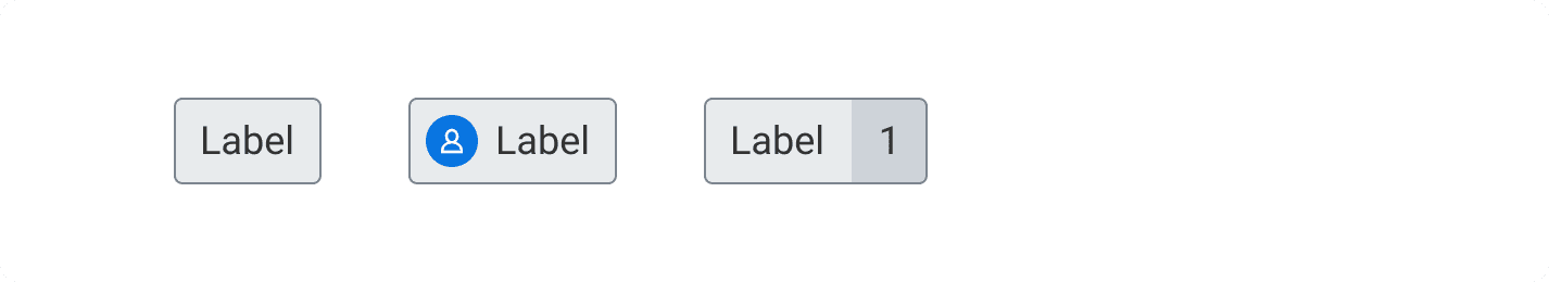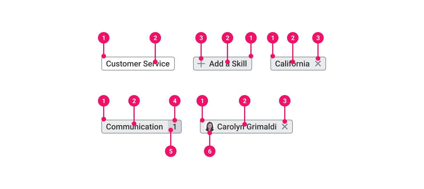 - Avatar: (Optional): A thumbnail photo or placeholder graphic used to represent a specific user that appears to the left of the pill label.
