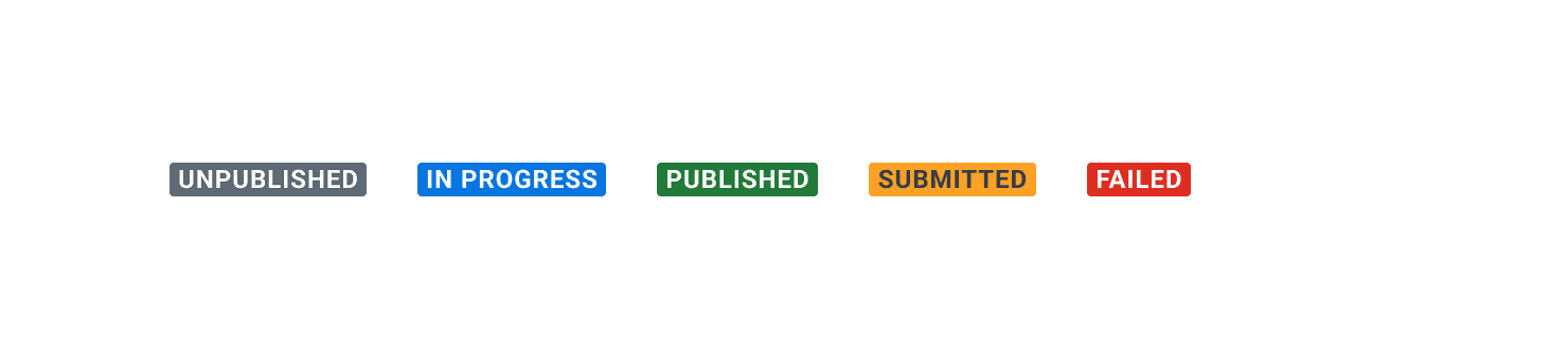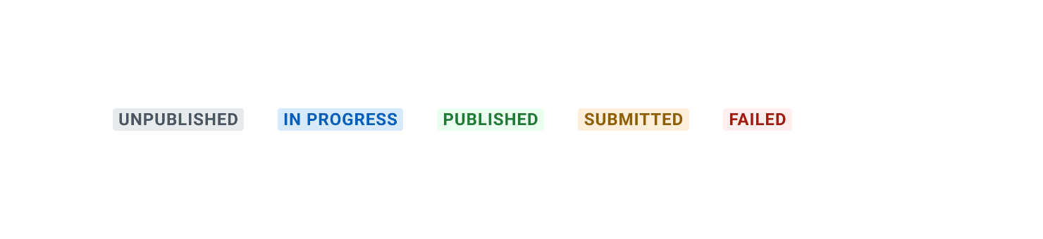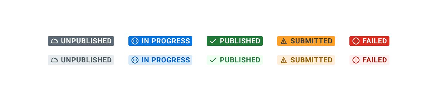 - Match semantic background colors with appropriate status text. For example, use red to indicate missing actions like “Not Submitted” or green for completed actions like “Published” or “Complete”.