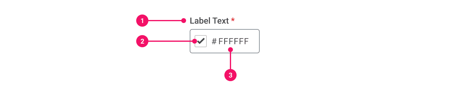- Active Color Swatch: Square container that shows what the color looks like. Checkmark is optional and could be set on when a valid hex value is entered in the text input.