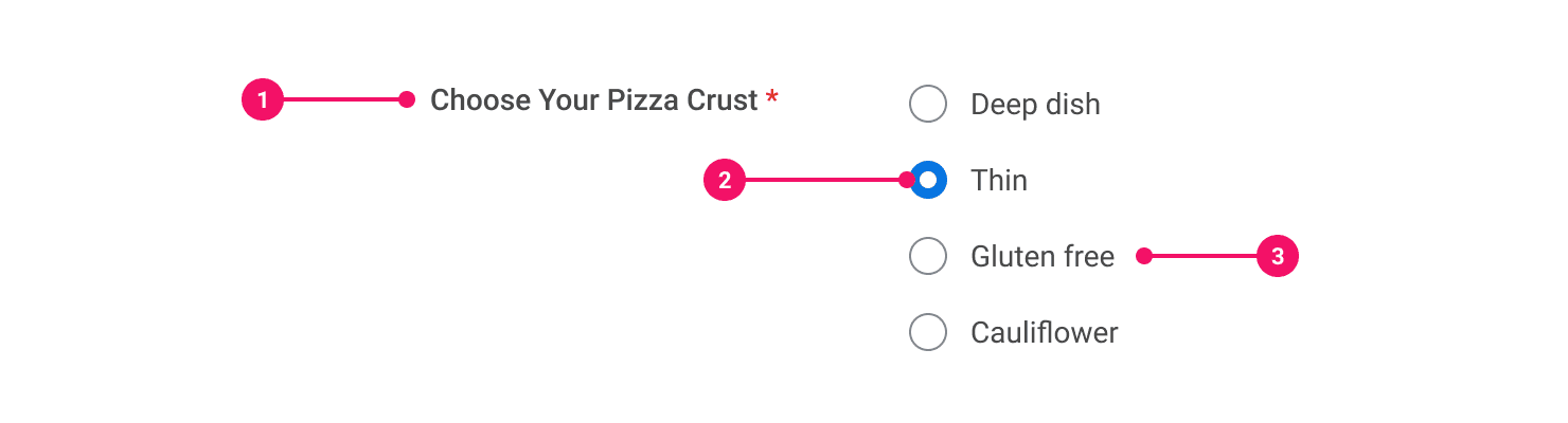 While associating labels to each radio button input is critical, radio buttons are used in groups of mutually exclusive choices. A group of choices requires context, such as, selecting your pizza crust. Designing a clear legend and building the context of the group is a key foundation for accessible radio buttons when users cannot visually perceive the layout.