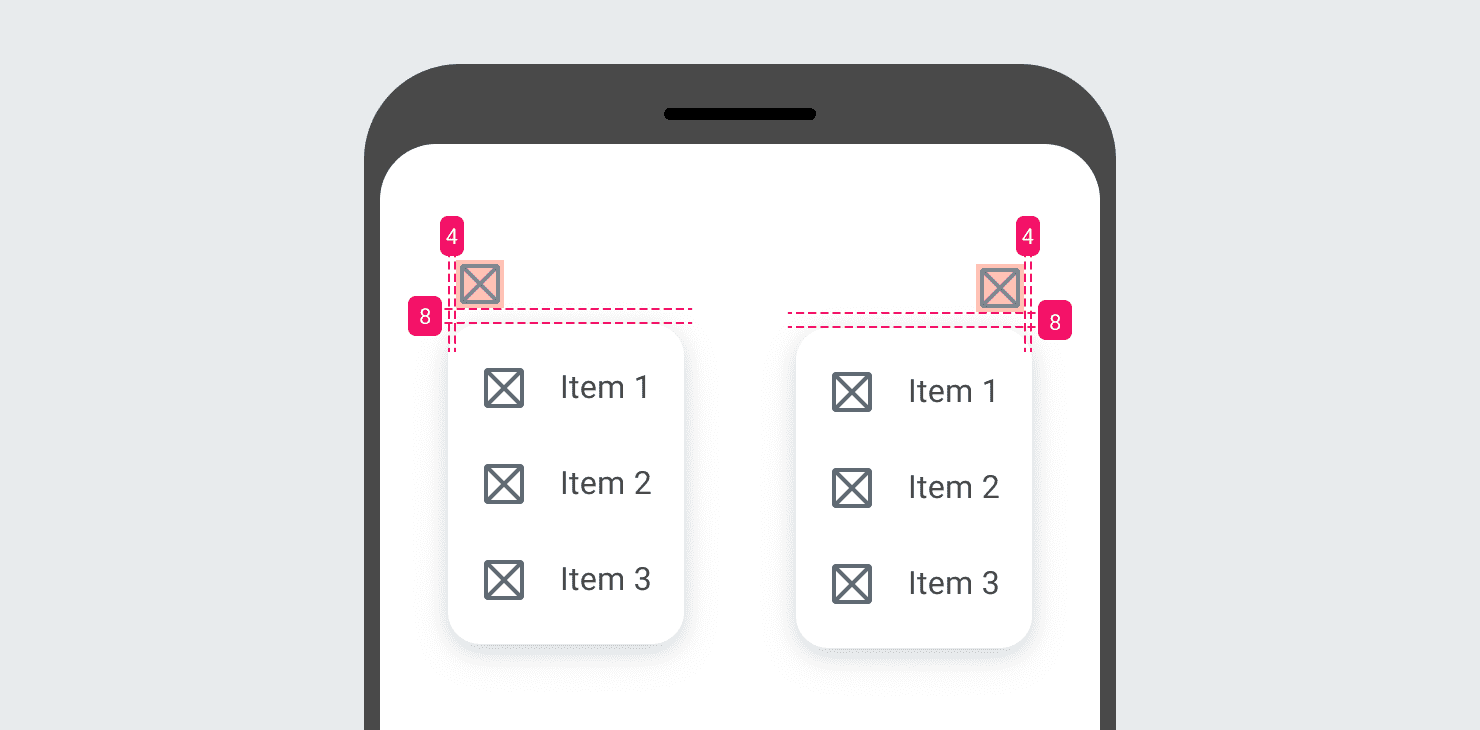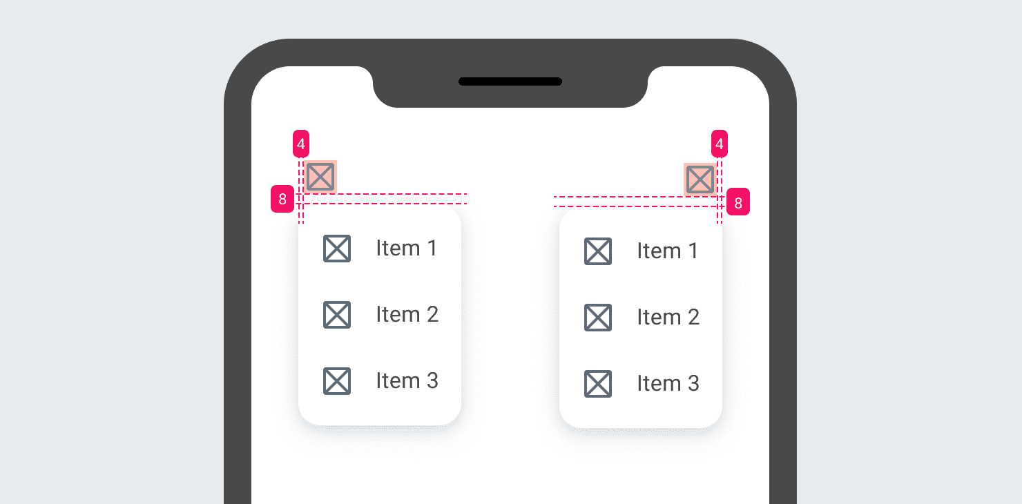 - Popup Menus should overlap and visually look like they are in front of other UI elements. They should always be positioned within the viewable areas of the screen and be 8px away from the element that launched them.