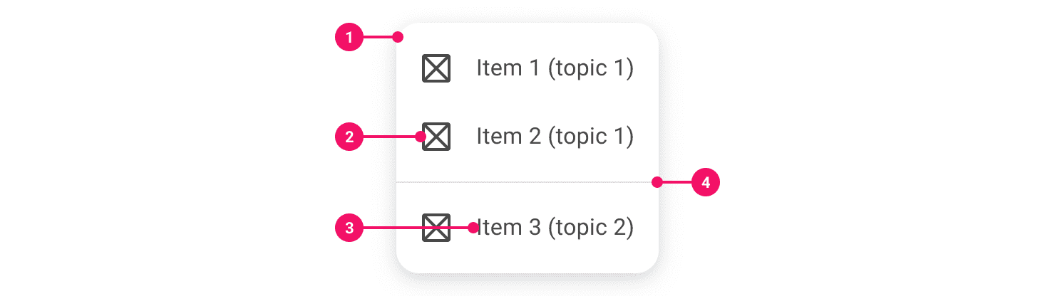 - Divider (Optional): A break in menu items to group related items or differentiate unrelated items.